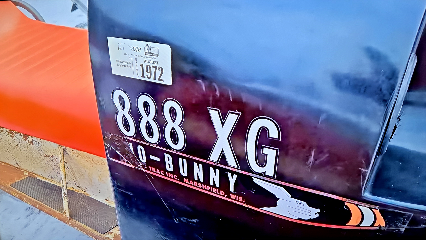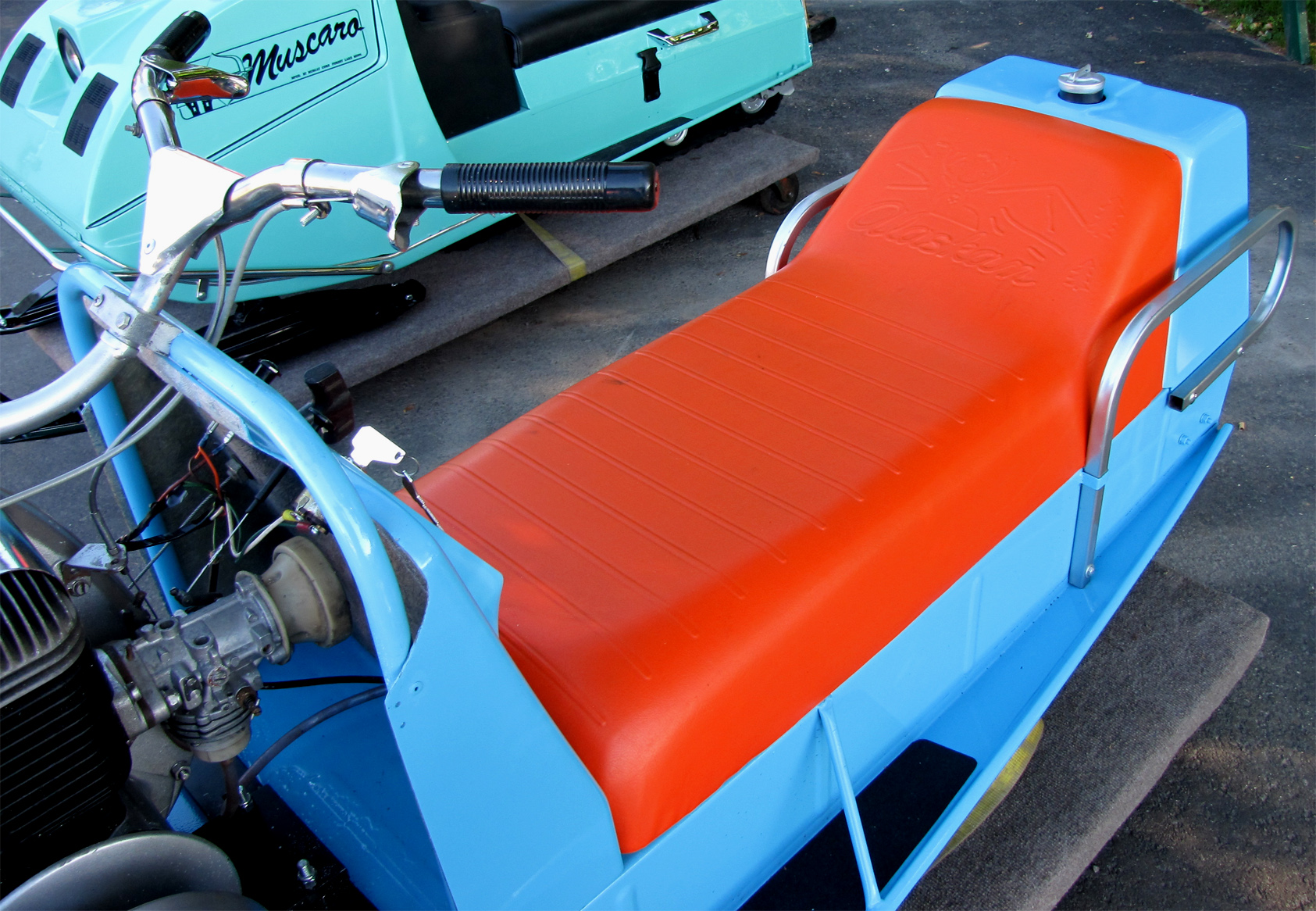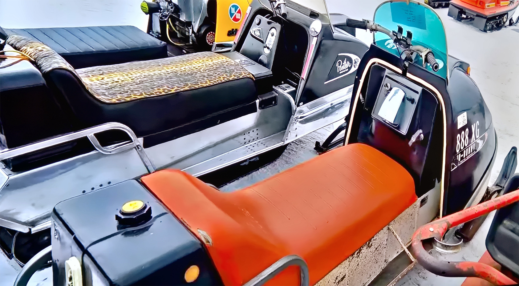 WITH A RED ALASKAN SNOWMOBILE SEAT.