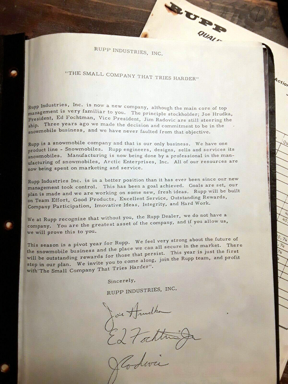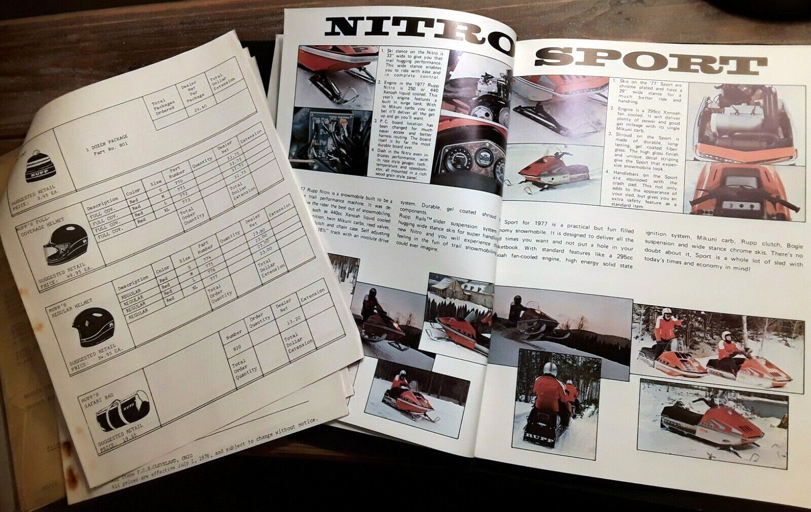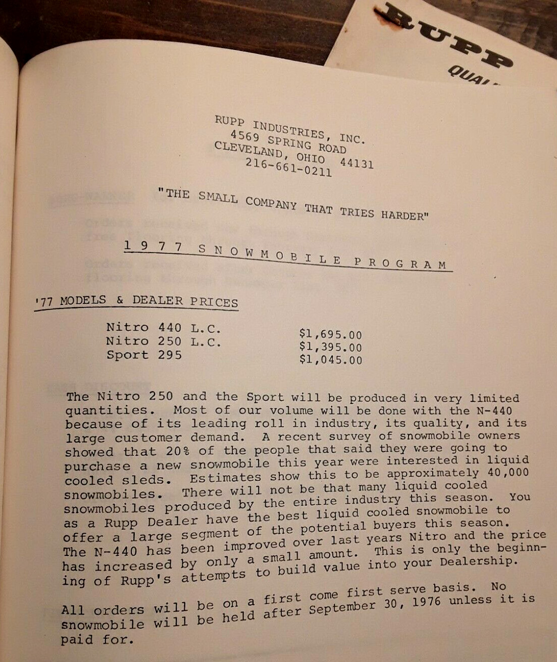 1977 RUPP SNOWMOBILE BROCHURE AND PRICELIST AND COMPANY INFORMATION.