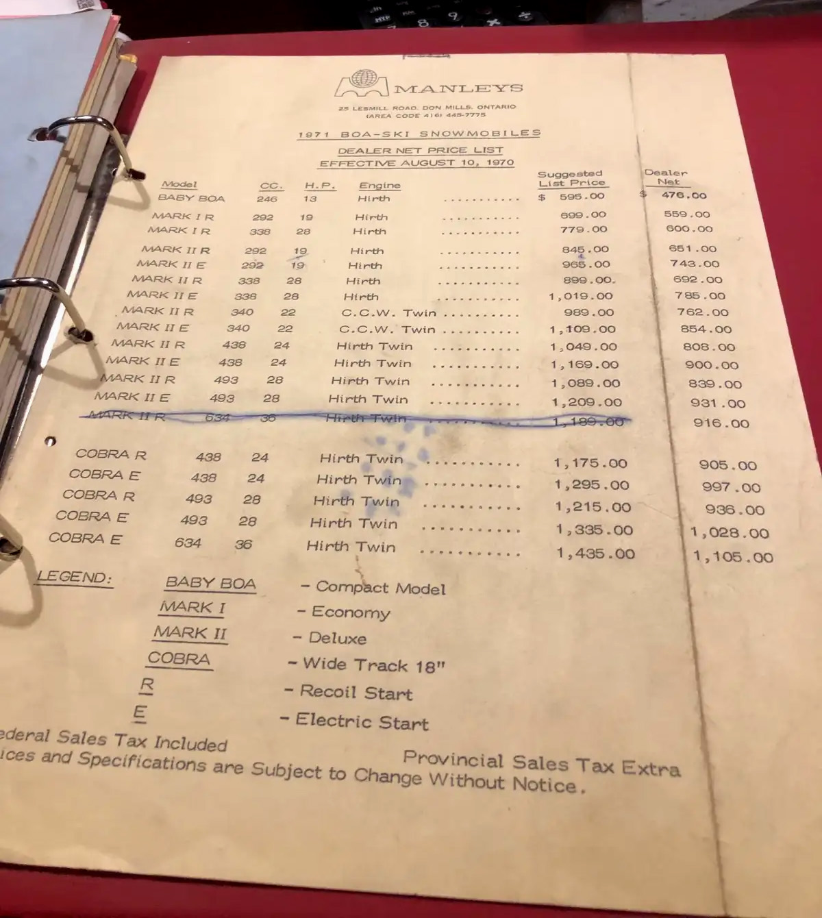 1971 BOA SKI SNOWMOBILE PRICELIST