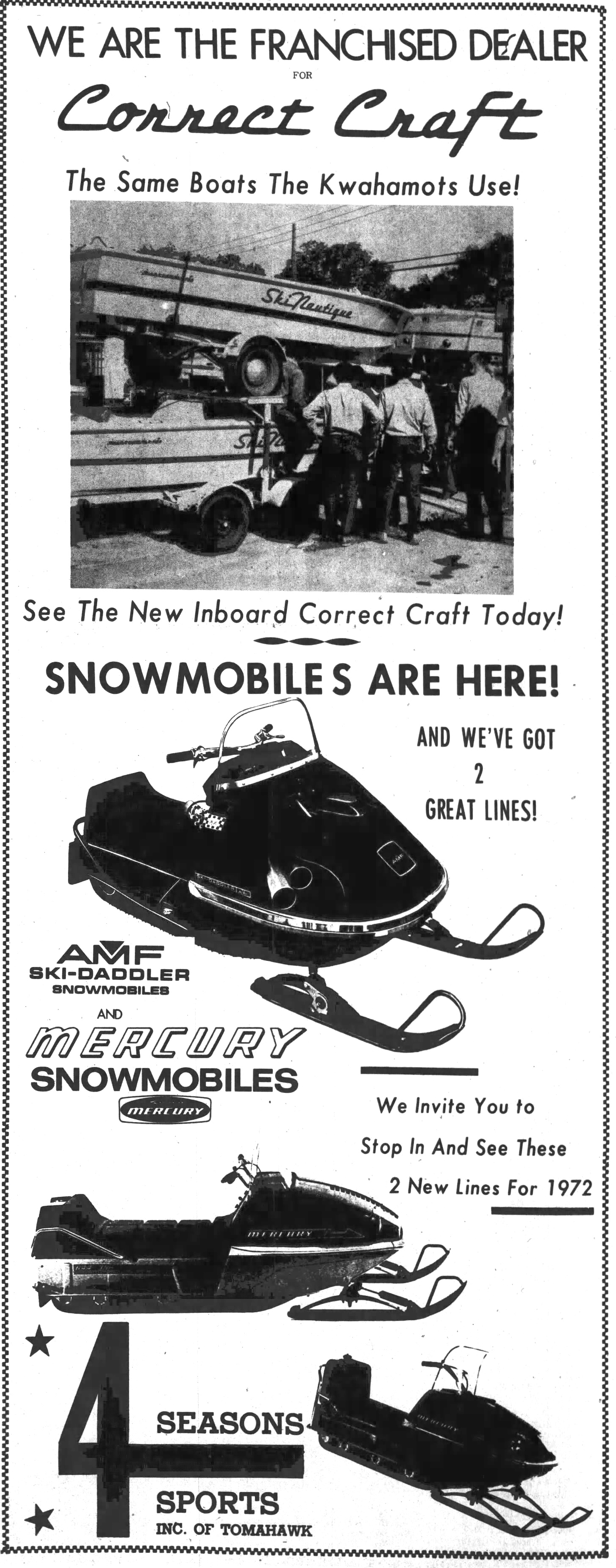 1972 SKI DADDLER AND MERCURY SNOWMOBILE AD