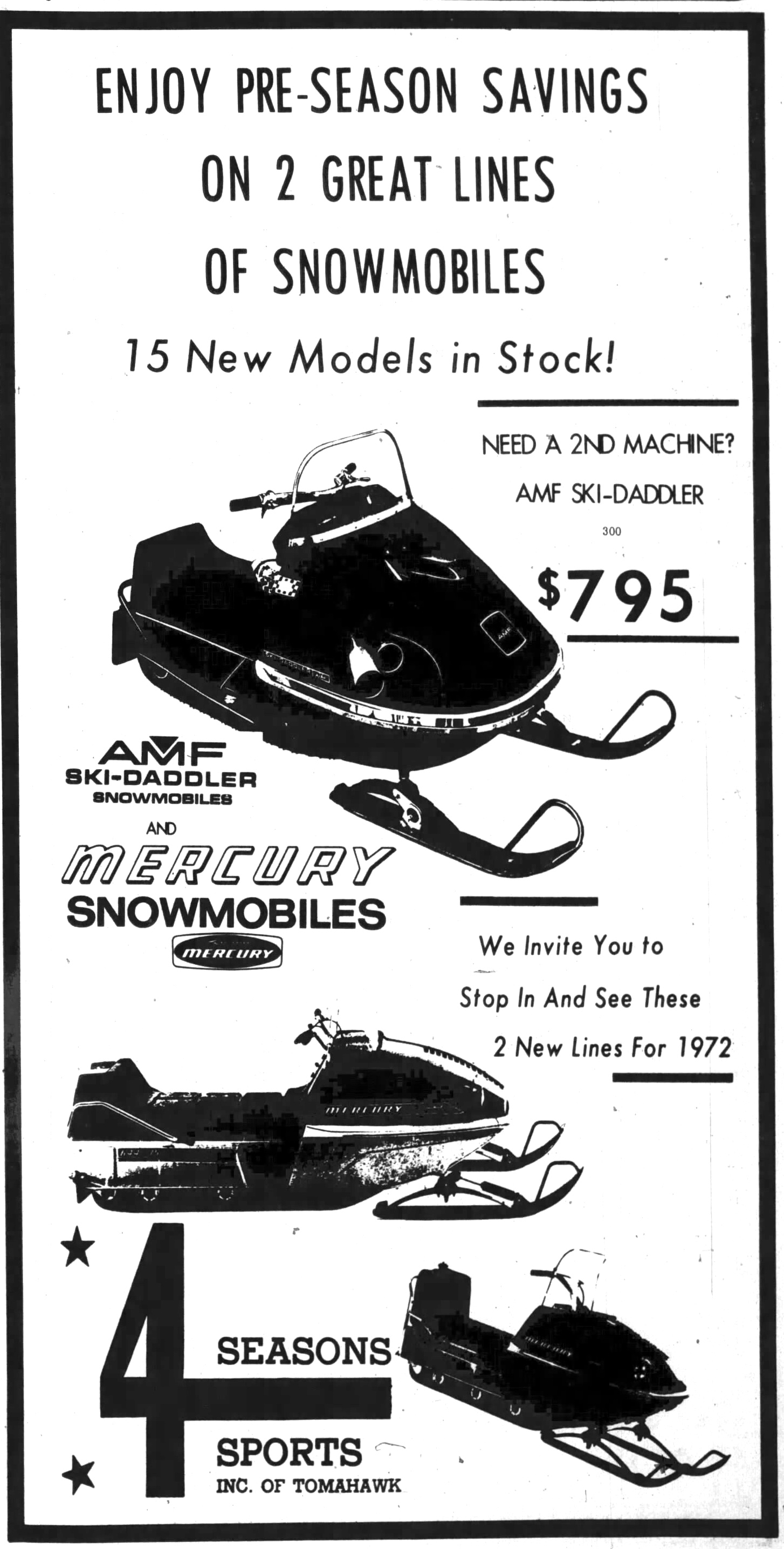 1972 SKI DADDLER AND MERCURY SNOWMOBILE AD |