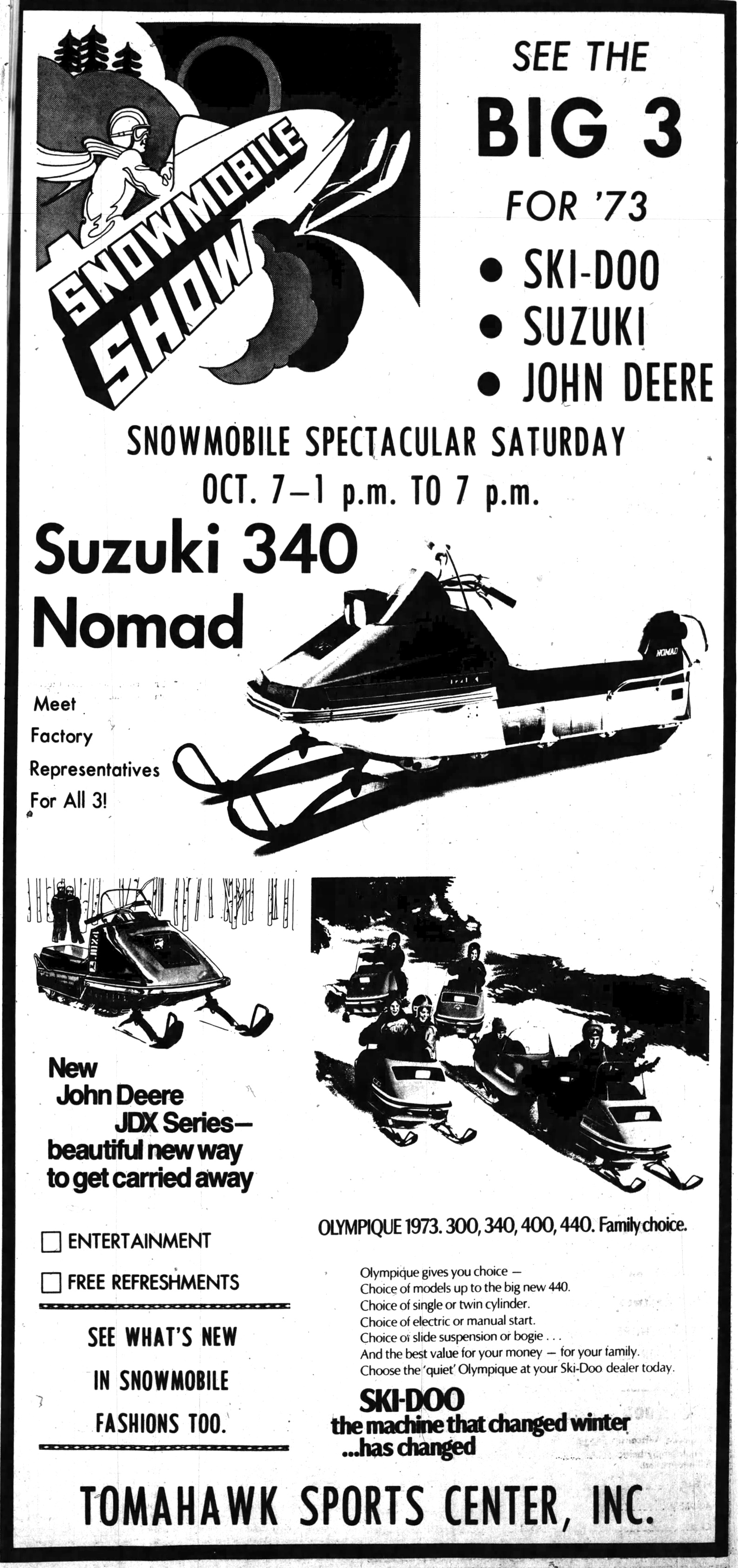 1973 SKI DOO, SUZUKI AND JOHN DEERE SNOWMOBILE AD |