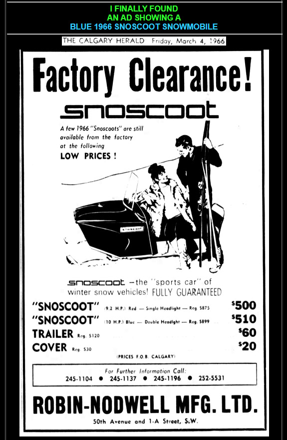 1966 SNOSCOOT SNOWMOBILE MODLES IN RED AND BLUE. AD