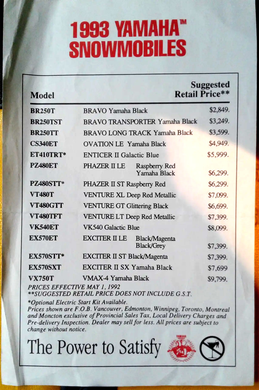 1993 YAMAHA SNOWMOBILE PRICE LIST |