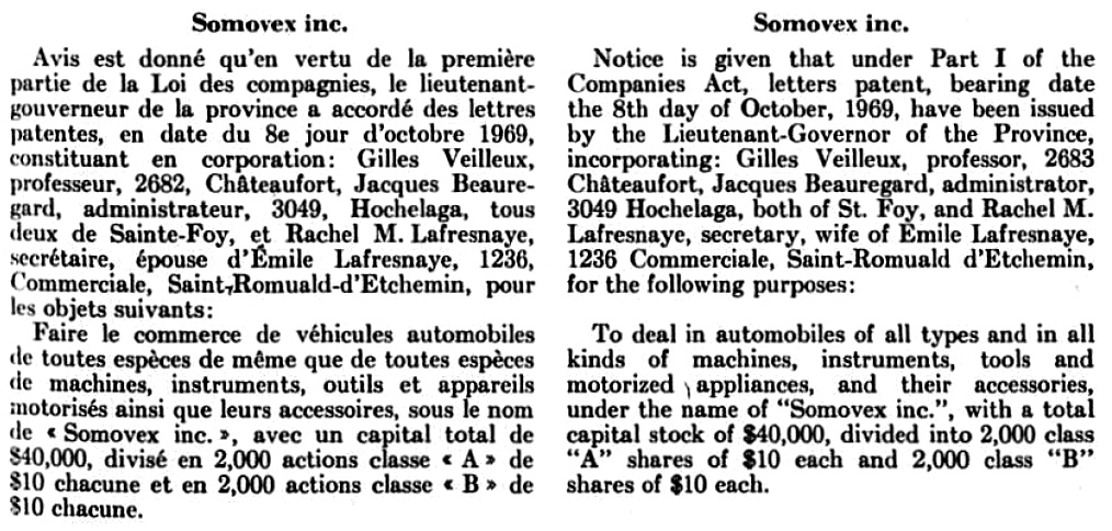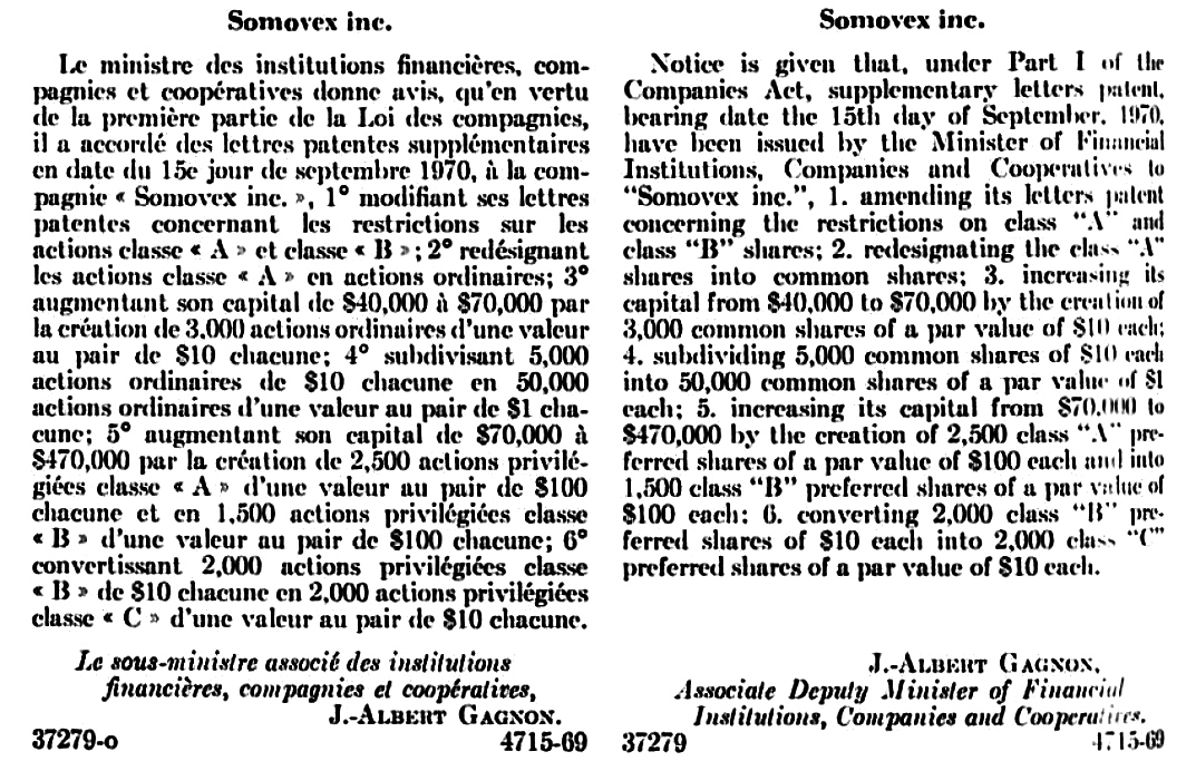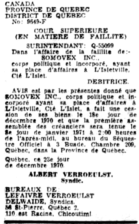 IS HEARBY GIVEN THAT SOMOVEX INC HAVING ITS PLACE OF BUSINESS IN L'ISET,